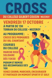 Cross du collège de Nozeroy 2025.   Vendredi 17 octobre de 13h à 16h30. Les dossards sont à récupérer à 12h45 sous le préau. Participation de tous les élèves non dispensés médicalement obligatoire. Evaluation finale de performance du cycle course de demi fond. Organisation: Départ et arrivée dans la cour du collège. 13h: 6èmes filles …